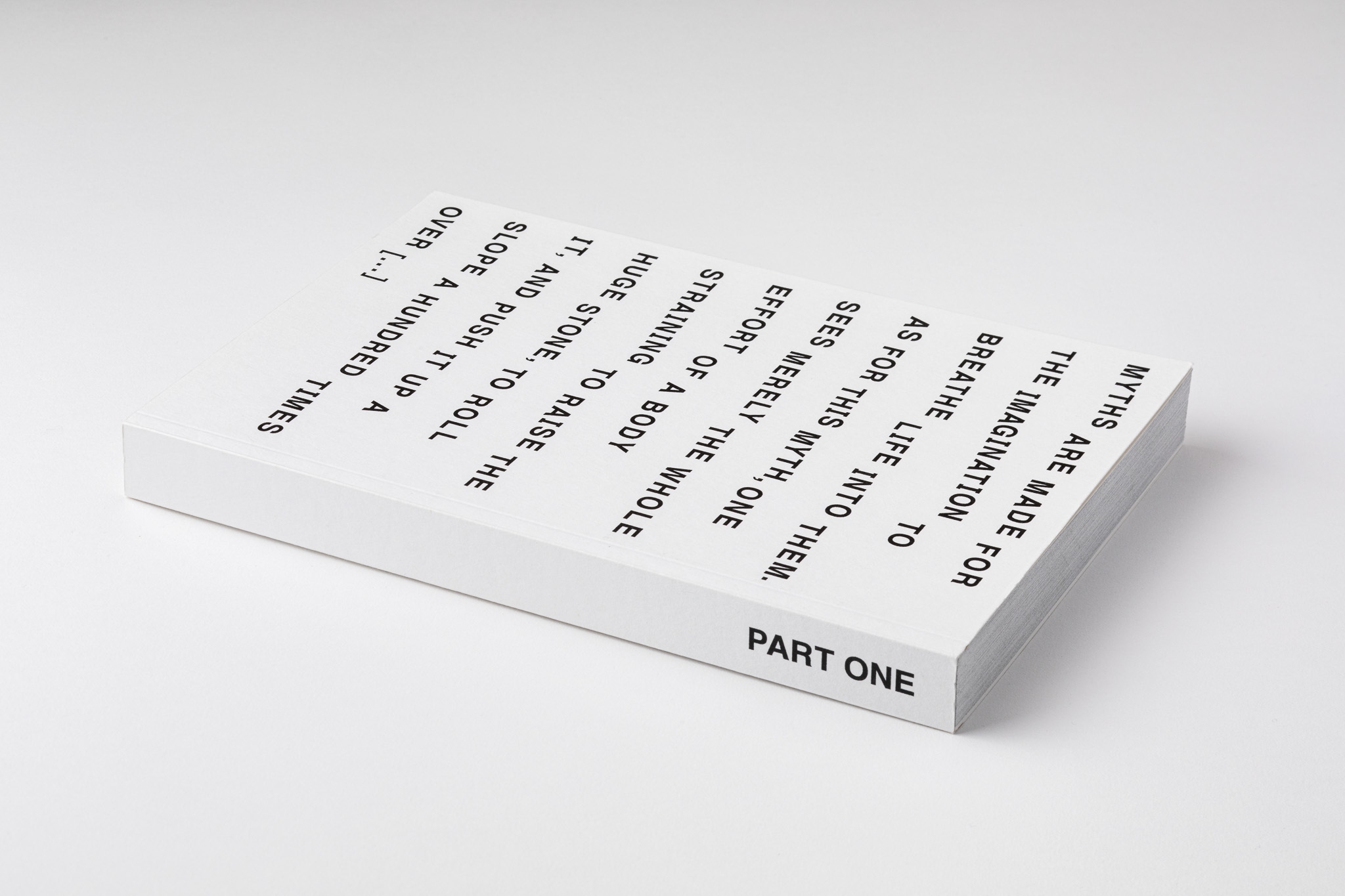 Part one is literally about beginning. The book binds together a collection of 101 found ‘Part one’ pages, reproducing the original page sizes, fonts and typographic placing. Printed in 2010 for an installation of 101 copies that were intended to stay together, followed by a market edition of 202 the next year and reissued in 303 copies with inverted white-on-black dust jackets in 2023, quoting Albert Camus about Sisyphus – an ongoing rehearsal, asking what it means to keep (or not give up) beginning.